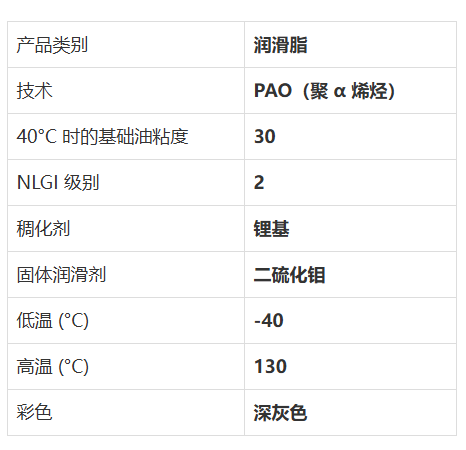 关键属性:长寿命、高速合成润滑脂,受益于固体润滑剂的协同效应